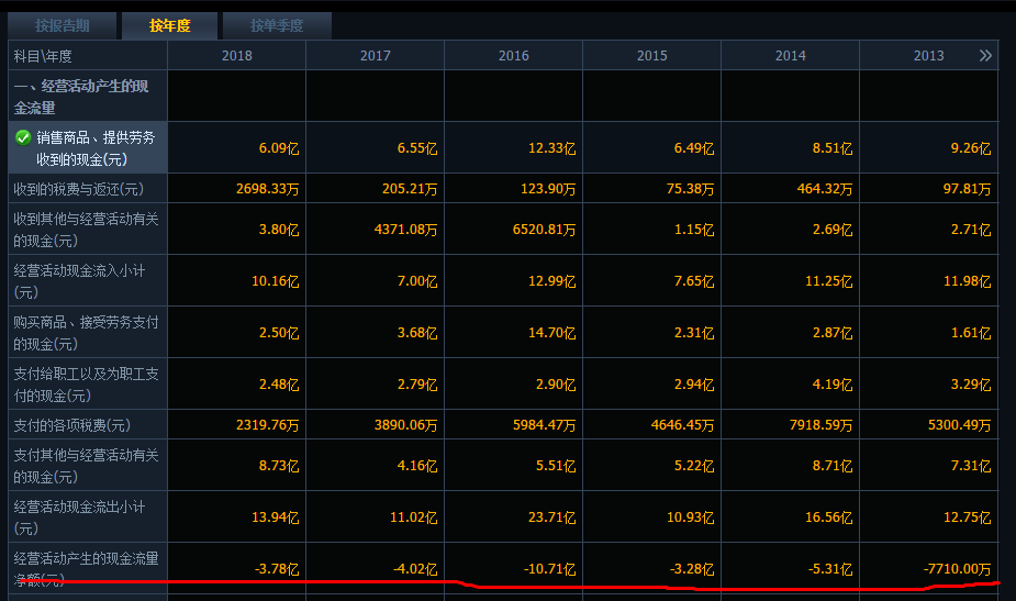 每一年的經(jīng)營現(xiàn)金凈流量都是大幅負值,這樣的報表,說明利潤很可能九成九都是虛增的,甚至是完全虛假的。