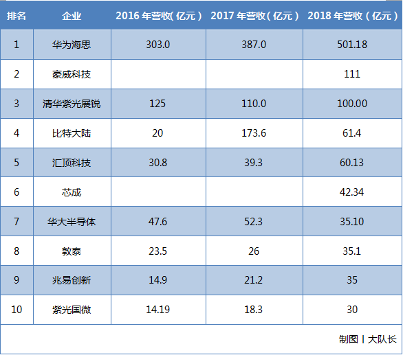 國內(nèi)2018年半導體設計企業(yè)收入排名,海思2018年以501.18億元人民幣排名第一,遙遙領先第二名。