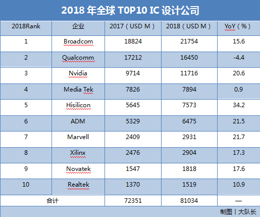 國內(nèi)沒有對手,那就放眼全球,2018年海思收入75.73億美元,落后于博通(218億)、高通(165億)、因特爾(117億)和臺灣的聯(lián)發(fā)科(79億),排名世界第5名,但是34%的增速遠遠高于前十12%的增速,進入前三甚至第一或許只是時間問題。