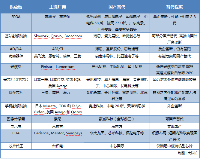 華為的大部分產(chǎn)品線所需進口的零部件均存在國產(chǎn)替代產(chǎn)品,但很多國產(chǎn)器件的性能暫時無法達到華為現(xiàn)有的“一流”供應商,少部分產(chǎn)品只能在低端市場或者部分環(huán)節(jié)實現(xiàn)替代。